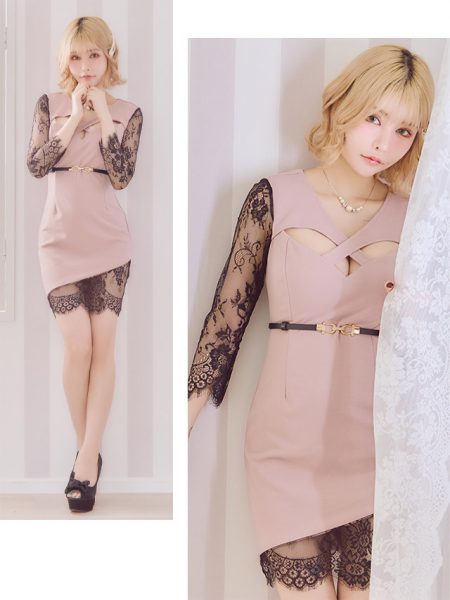 袖ありスカラップレース切替バストクロスウエストベルト付きタイトミニドレス