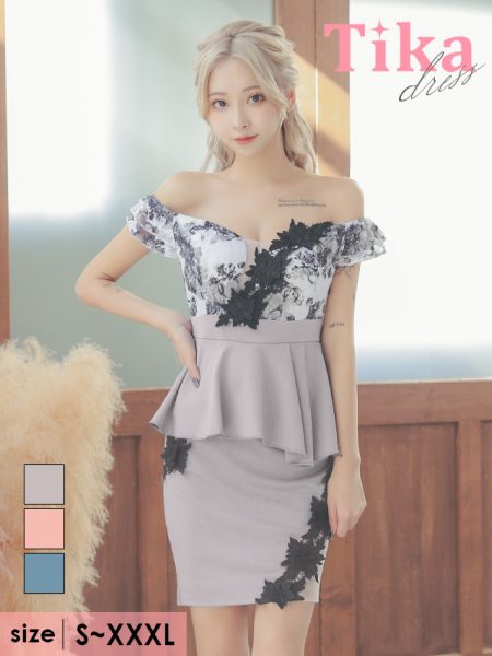 オフショルダー立体フラワーレース切り替えペプラムデザインタイトミニドレス
