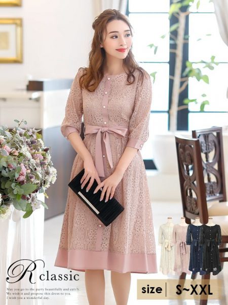 総レースサテンウエストリボンフェミニンAラインフレアミニ結婚式パーティードレス