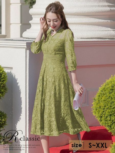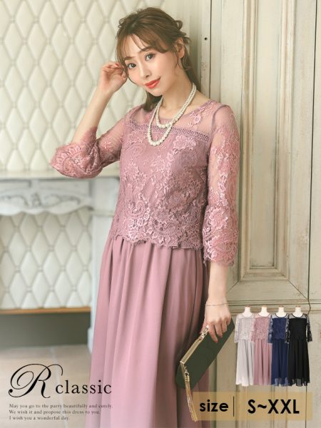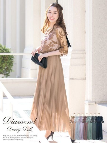 フラワー刺繍レース切替プリーツフェミニンAラインフレアロング結婚式パーティードレス