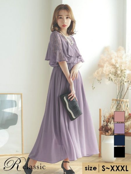 レース切り替え胸元ペプラムフェミニンAラインシフォンフレアロング結婚式パーティードレス