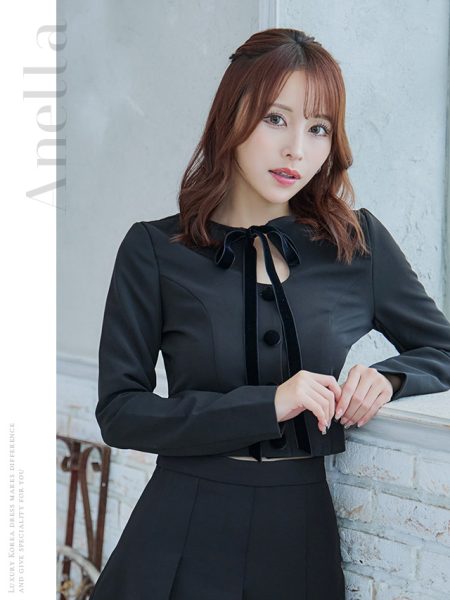 セットアップ長袖パフスリーブブラウス×ハイウエスト切替フレアミニドレス