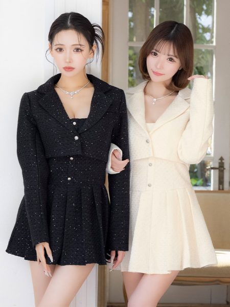長袖ハイウエスト切替胸元フリルリボンチュールセットアップパフツイードフレアミニドレス