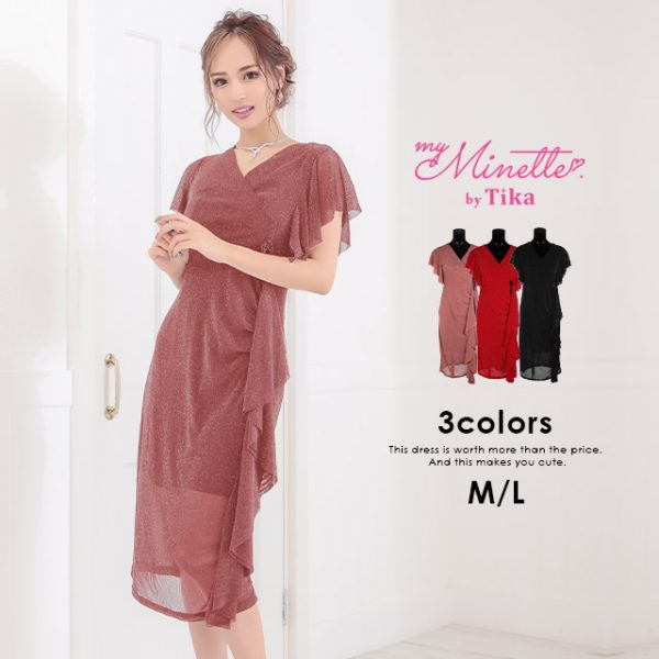 ワンカラーフリル袖ラメプチプラタイト膝丈半袖ドレスワンピース