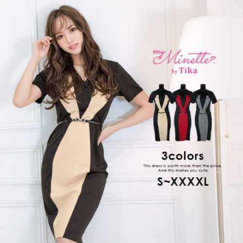 ウエストくびれベルトバイカラータイト膝丈半袖プチプラドレス