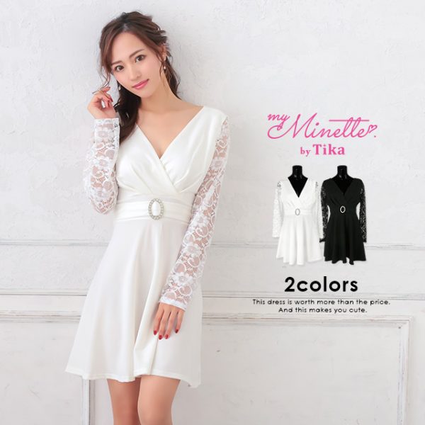 長袖レースビジューリングハイウエスト切替フレアミニドレス