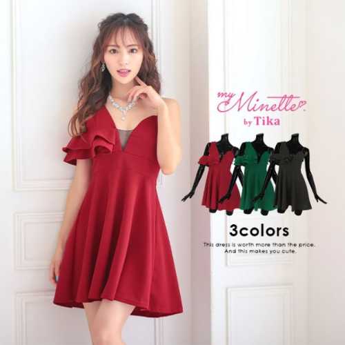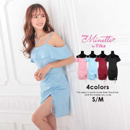 肩あきギャザースリット胸元フリルタイトミニドレス