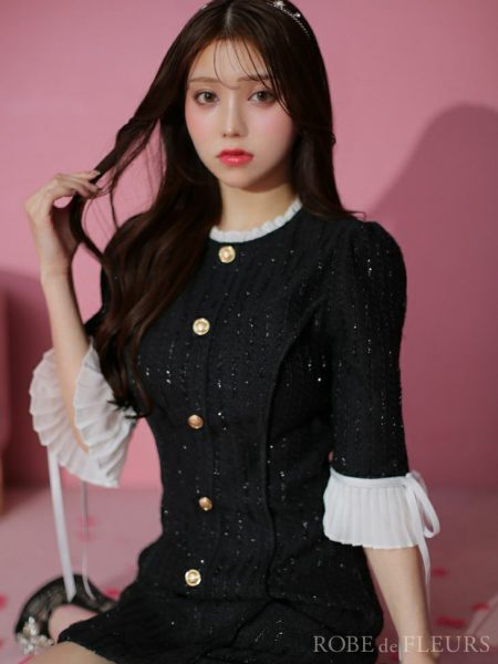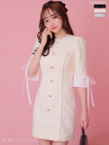 高級袖ありフリルリボンツイードラメタイトミニドレス