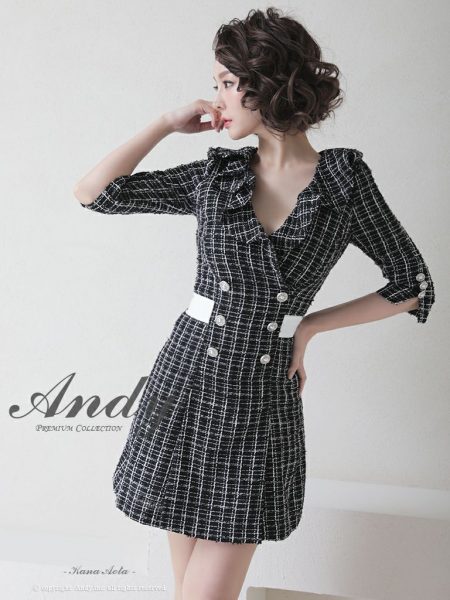 高級袖ありフリルリボンツイードラメタイトミニドレス