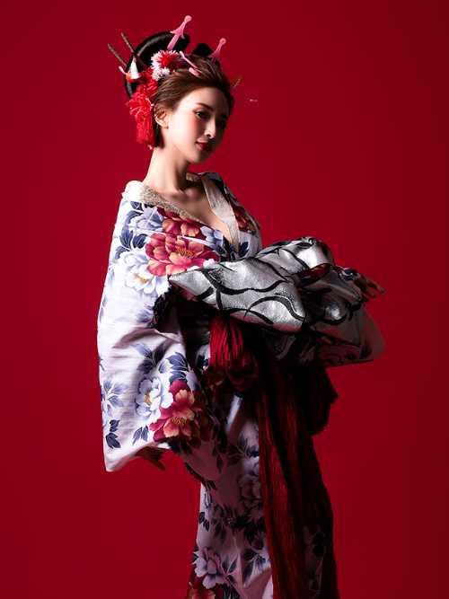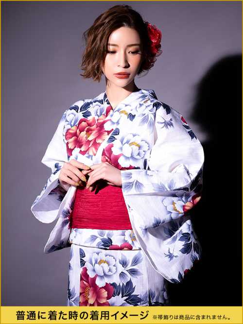 [花魁] 白地×華やか牡丹 2way おいらん浴衣5点セット (浴衣+下駄+兵児帯+兵児帯+肌襦袢)