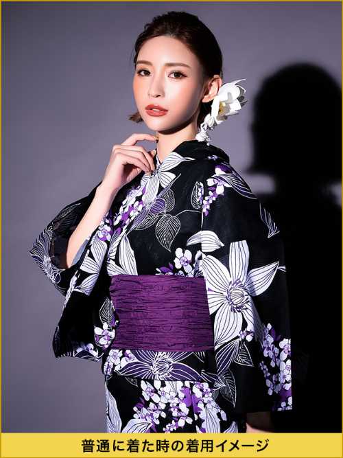 [花魁] 黒地×片陰に鉄線の花柄 2way おいらん浴衣5点セット (浴衣+下駄+兵児帯+兵児帯+肌襦袢)