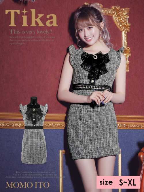 ブローチ付きフリルスリーブウエストレースツイードタイトミニドレス