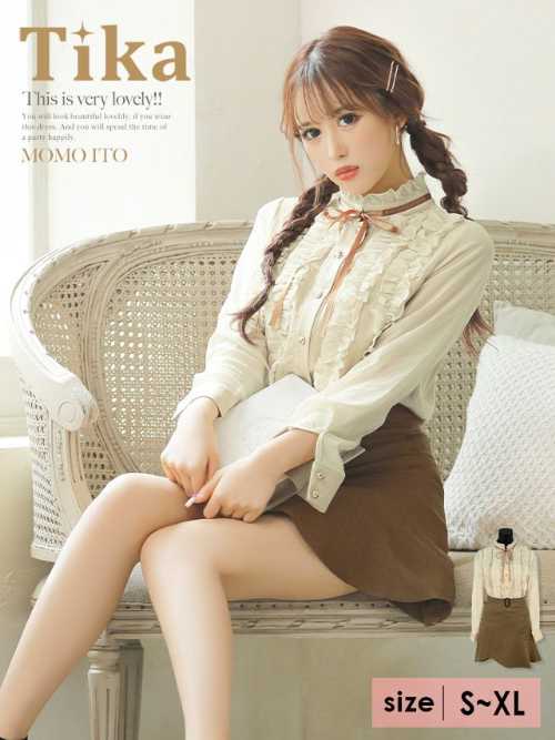 フリルハイネックリボン長袖ブラウスフレアミニスカートクラシカルセットアップドレス