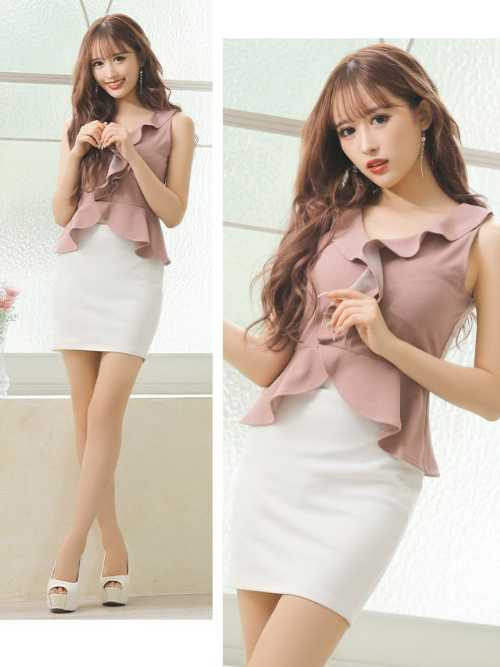 Vネックフリルぺプラムトップス×タイトミニスカートセットアップドレス