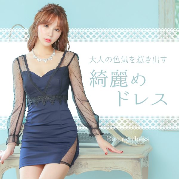 ドット柄チュール切り替え刺繍デザイン長袖タイトミニドレス