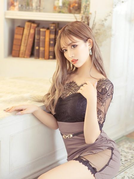 総レースネックリボン袖ありウエストベルト切替タイトミニドレス