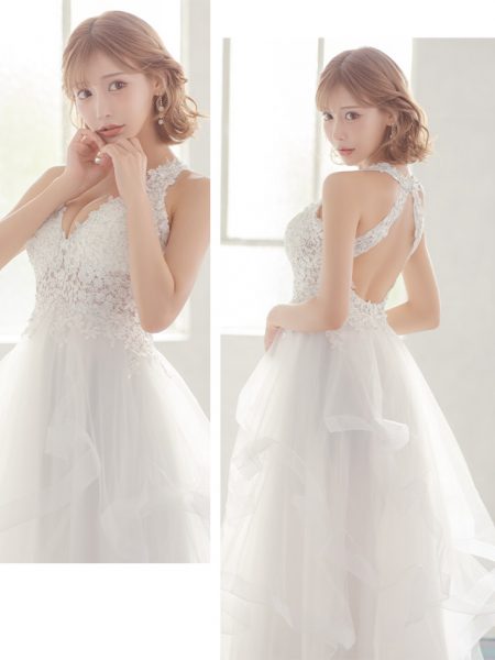 ネックリボンフリル袖シースルーフラワー総刺繍フレアミニドレス
