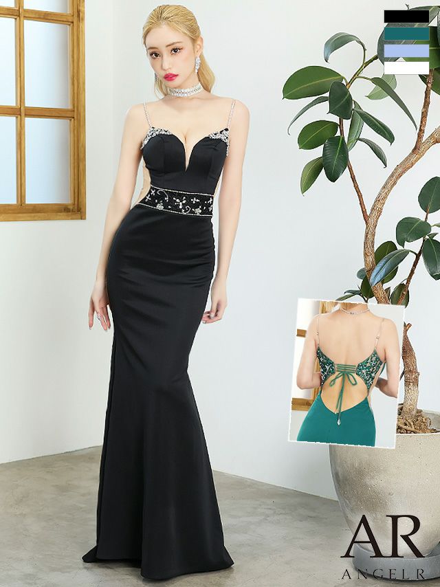 5. [Angel-R/エンジェルアール] 高級フラワースパンコールレース切替ウエストビジューバックレースアップキャミソールくびれタイトロングドレス