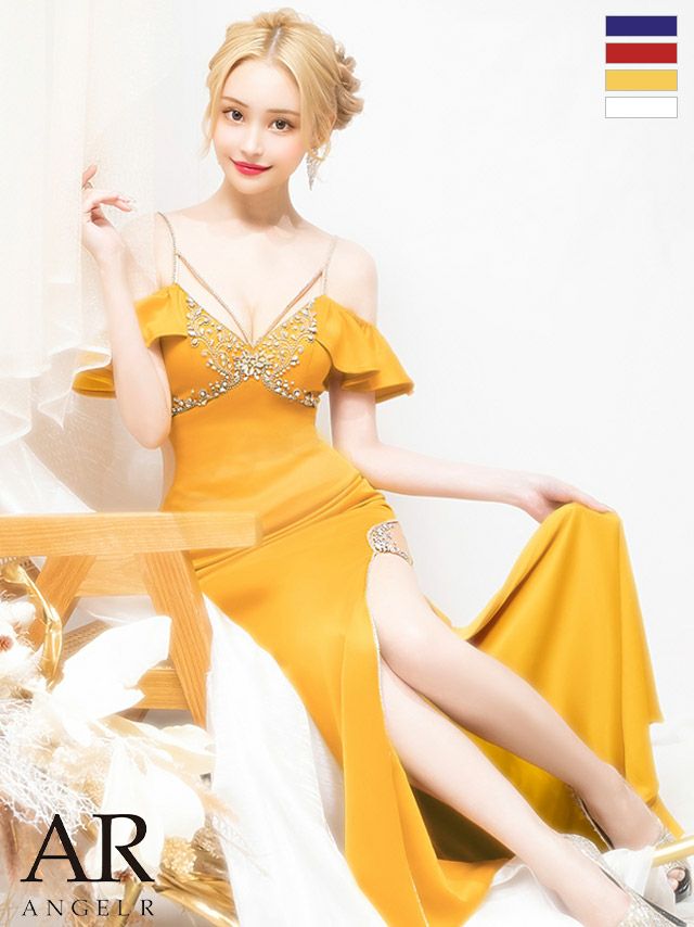 キャバドレス ロングドレス Angel-R エンジェルアール 高級肩あきくびれスリットフラワービジュータイトロングドレス