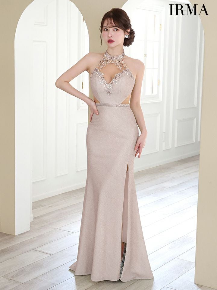 色気ある美ボディラインをアピール♪ [IRMA/イルマ] 高級ホルターネックエレガントビジューくびれラメニットタイトロングドレス