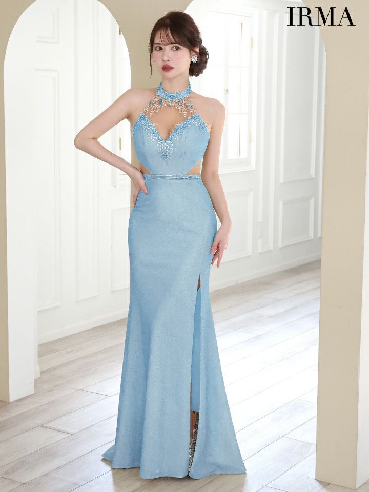 3. [IRMA/イルマ] 高級ホルターネックエレガントビジューくびれラメニットタイトロングドレス