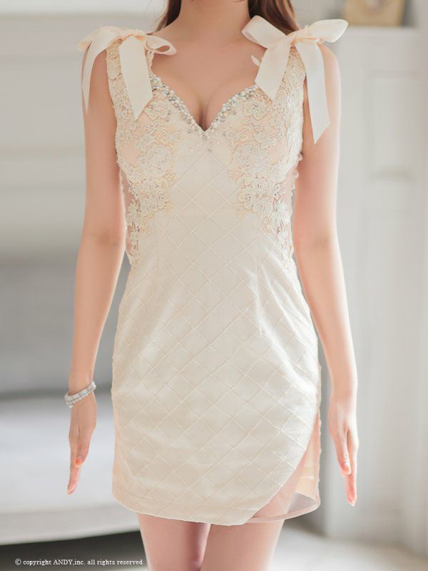 レースとリボンで女子力UP☆ [an/アン] 高級ノースリーブリボンレースビジューシアーくびれタイトミニドレス