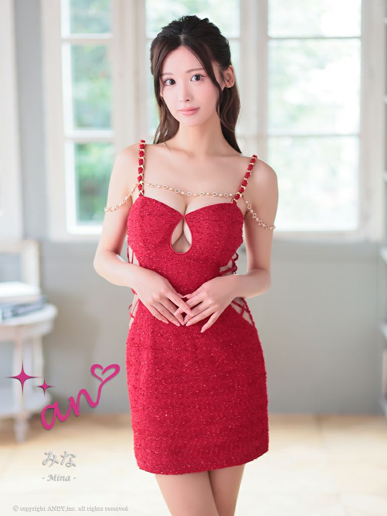 キャバドレス an アン 高級ツイードキャミソールくびれショルダーリボンチェーンバストカットタイトミニドレス