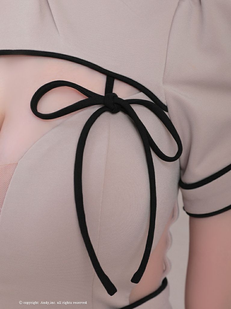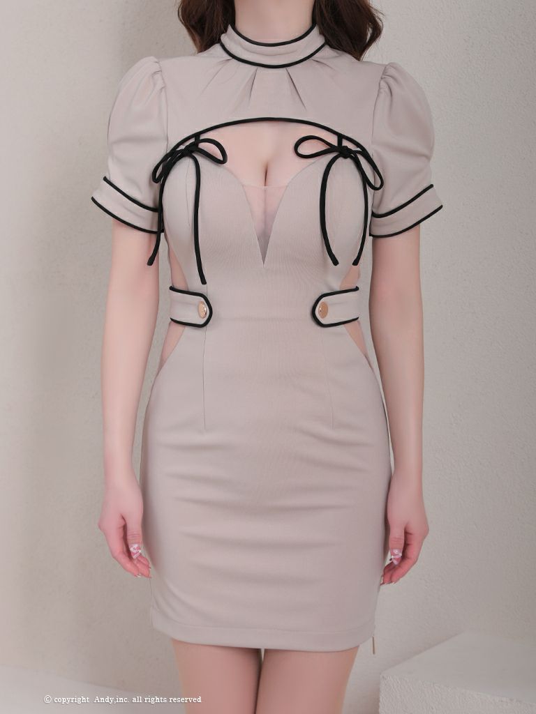 ガーリーで上品な色使い♪ [AndyGLAMOROUS/アンディグラマラス] 高級 バストカット リボン ハイネック ウエストカット くびれ. パフスリーブ 半袖 谷間魅せ タイトミニドレス
