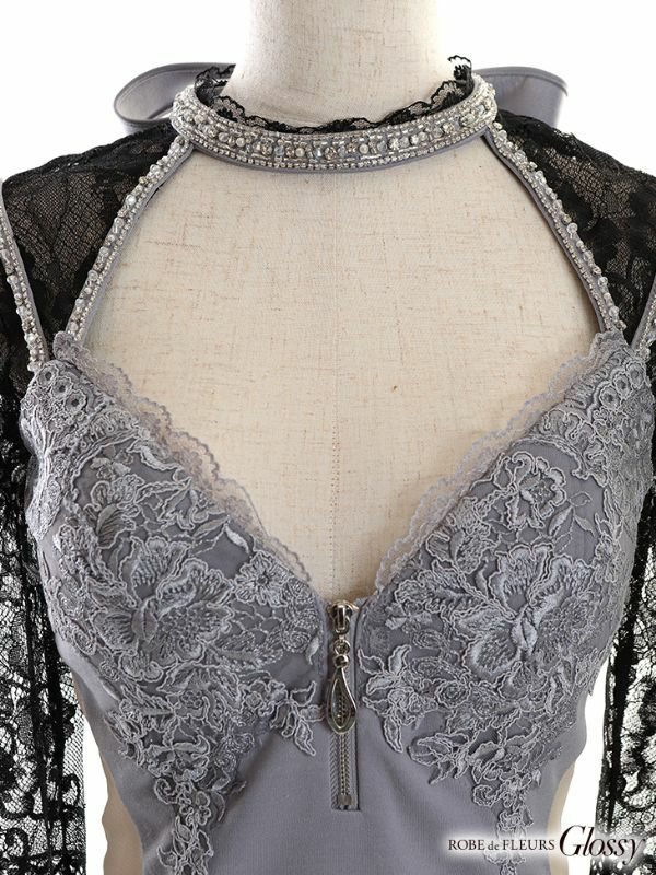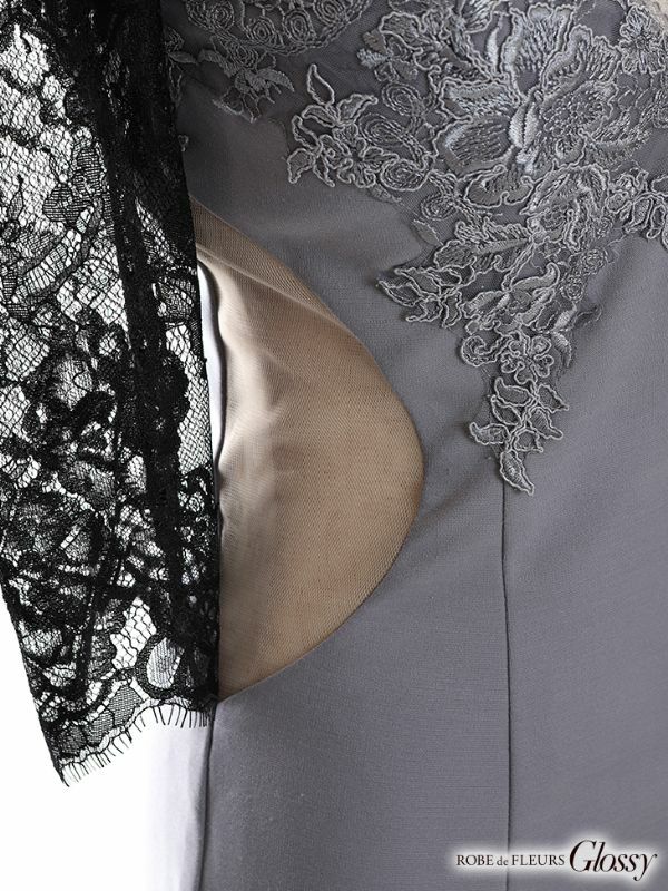 6. [ROBEdeFLEURSGlossy/ローブドフルールグロッシー] 高級 袖あり レース バストカット ジップ くびれ チュール切替 谷間魅せ タイトミニドレス