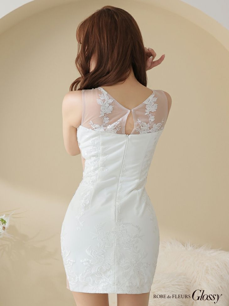 4. [ROBEdeFLEURSGlossy/ローブドフルールグロッシー] 高級スカラップレース×サイドチュールティールブルーノースリーブくびれタイトミニドレス