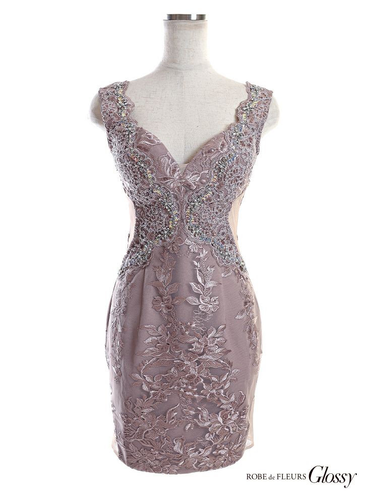 胸元を強調したセクシーデザイン☆ [ROBEdeFLEURSGlossy/ローブドフルールグロッシー] 高級スカラップレース×サイドチュールティールブルーノースリーブくびれタイトミニドレス
