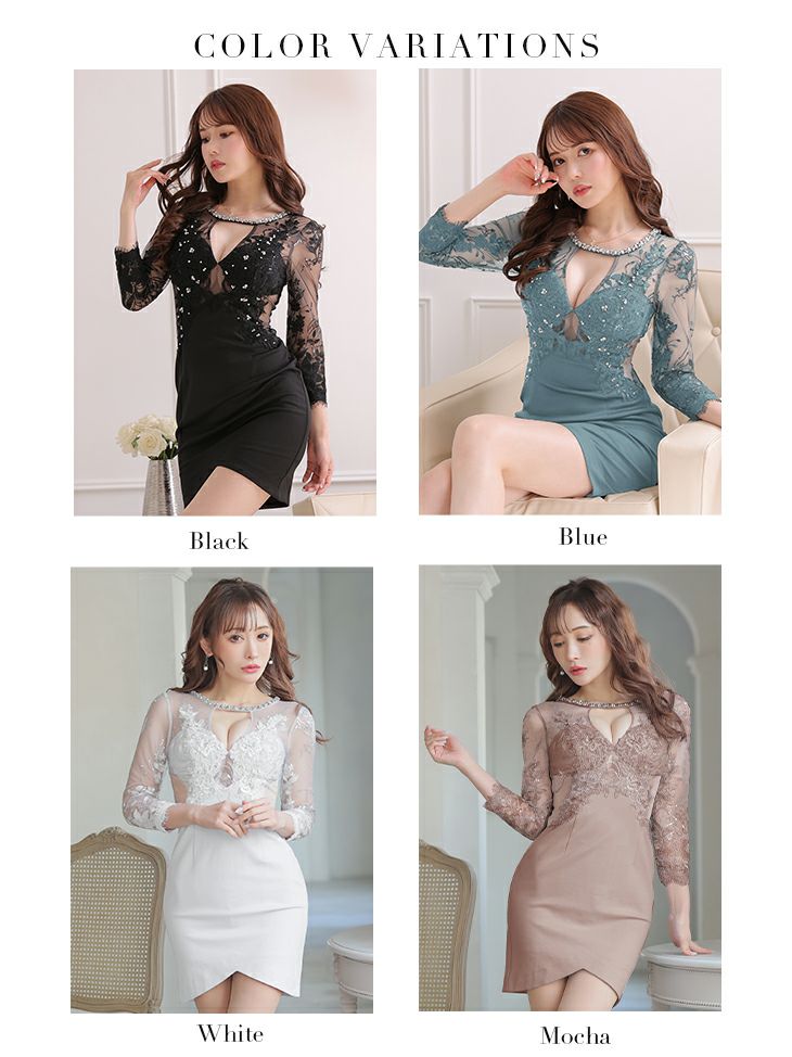 4. [ROBEdeFLEURSGlossy/ローブドフルールグロッシー] 高級 バストカット 袖あり フラワー刺繍レース ウエストチュール切替 くびれ 谷間魅せ タイトミニドレス