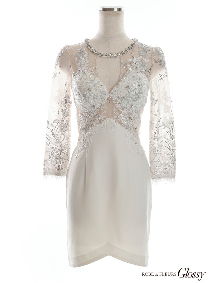 ROBEdeFLEURSGlossy ローブドフルールグロッシー 高級バストカット長袖フラワー刺繍レースウエストチュール切替タイトミニドレス