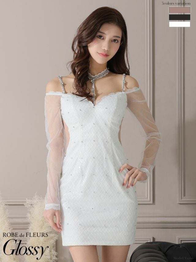 6. [ROBEdeFLEURSGlossy/ローブドフルールグロッシー] 高級リボンビジューチョーカー付きダイヤチュールビジューストラップ長袖 袖ありくびれタイトミニドレス