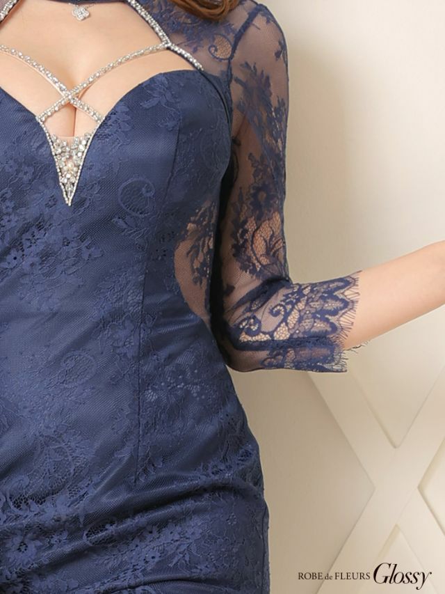 レース×ビジューで高級感溢れる☆ [ROBEdeFLEURSGlossy/ローブドフルールグロッシー] 高級 レーススリーブ デコルテクロスビジュー バストカット 肩出し 二の腕カバー 袖あり くびれ 谷間魅せ タイトミニドレス
