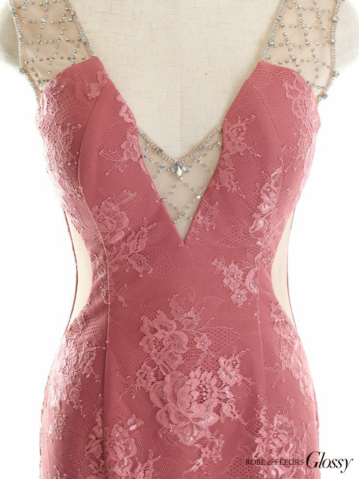 5. [ROBEdeFLEURSGlossy/ローブドフルールグロッシー] 高級ショルダーバストチュールビジューワンカラーフラワーレースノースリーブくびれタイトミニドレス