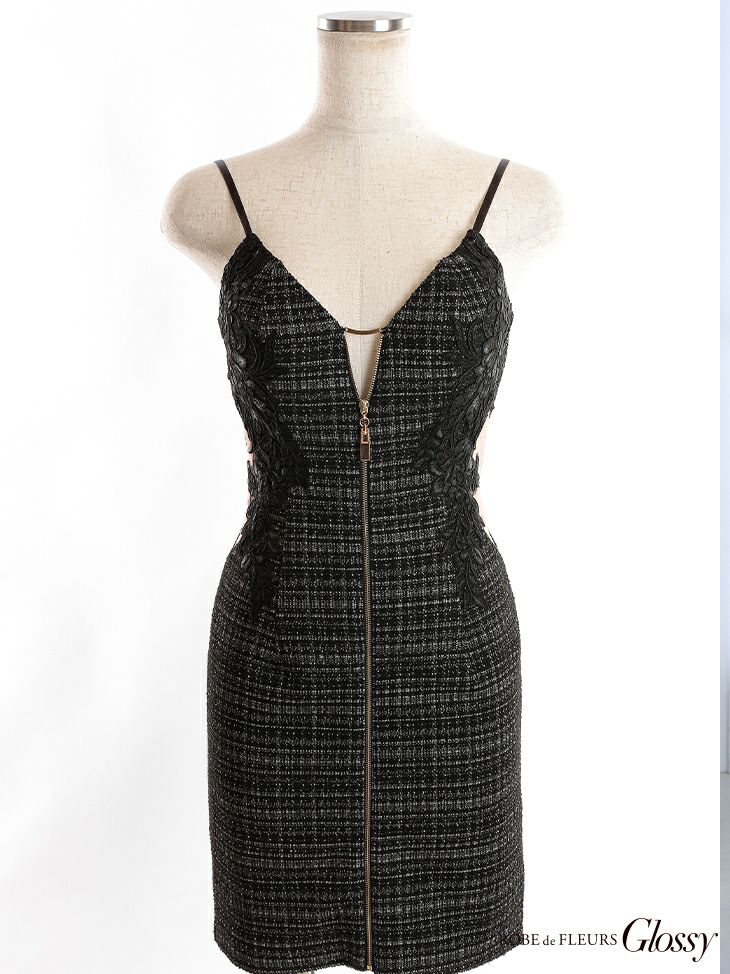 ROBEdeFLEURSGlossy ローブドフルールグロッシー 高級フロントジップツイードくびれ刺繍ヌーディーシアーキャミソールタイトミニドレス