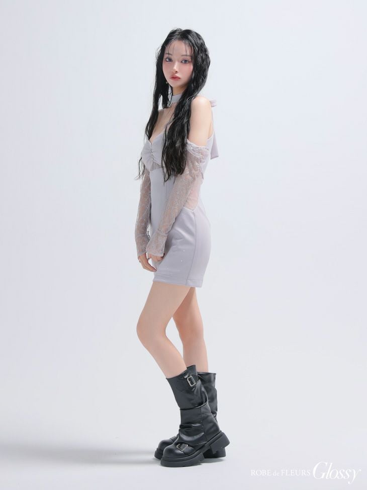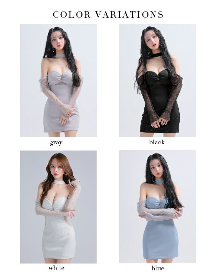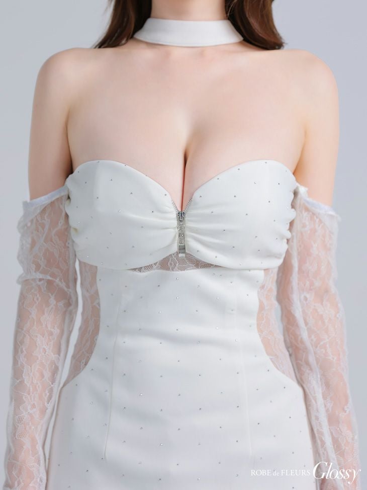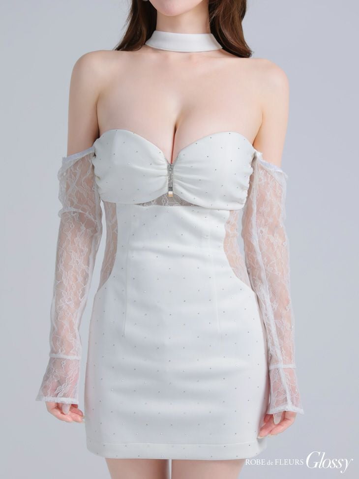 取り外しのできるレース袖付き♡ [ROBEdeFLEURSGlossy/ローブドフルールグロッシー] 高級 ブランド タイトミニドレス 谷間 長袖 くびれ透け ベア チョーカーネック レーススリーブ付き