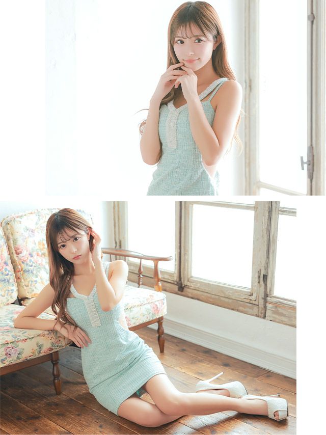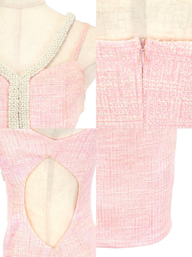 ツイード×パステルで女子力UP♪ キャミソールパールくびれシアー切り替えツイードミックスタイトミニドレス (Sサイズ~Lサイズ) (聖菜/キャバドレス着用)
