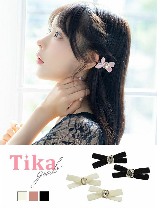 ビジュー付きベロアリボンクリップ2個セットヘアアクセサリーのカラバリ画像