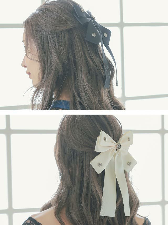 煌めくビジューがアクセント♪ ビジュー付きロングリボンバレッタヘアアクセサリー
