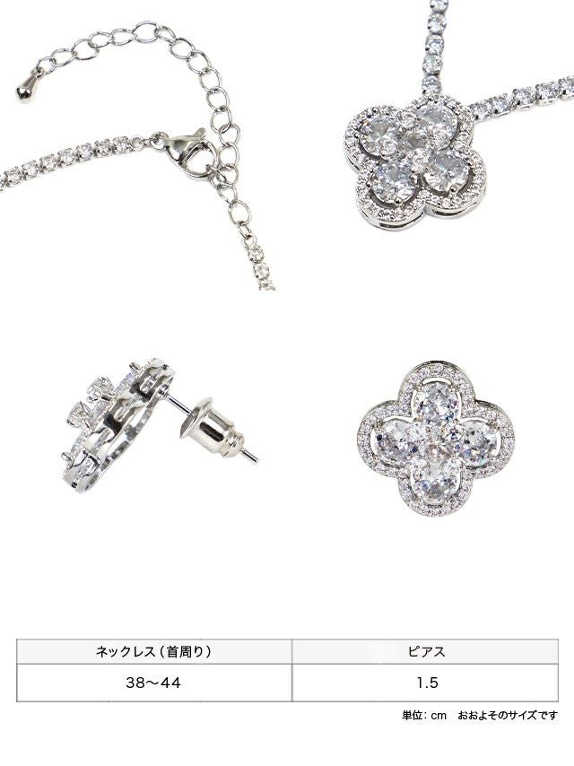 幸せを呼ぶキラキラアクセ☆ クローバー フラワーモチーフ キラキラビジュー アクセサリー 2点セット [ネックレス+ピアス]