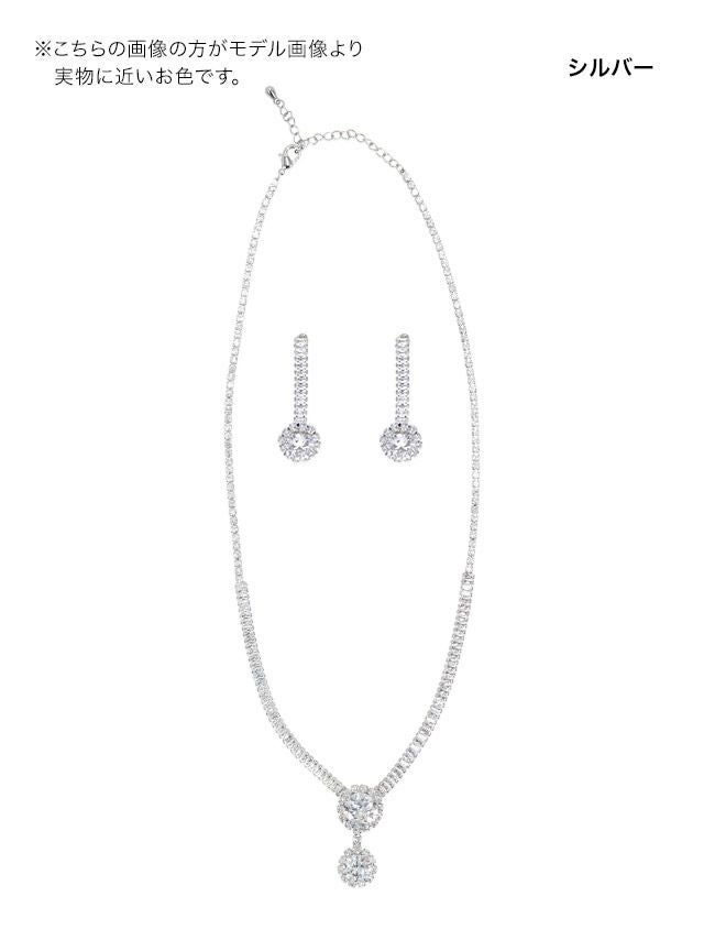 3. ラウンドストーンビジューシルバーアクセサリー2点セット [ネックレス+ピアス]