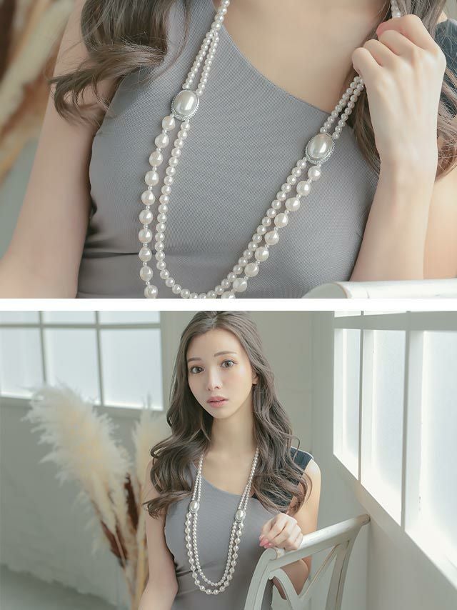 ビジューフレームパールロング2連ネックレスのディティール、サイズ