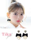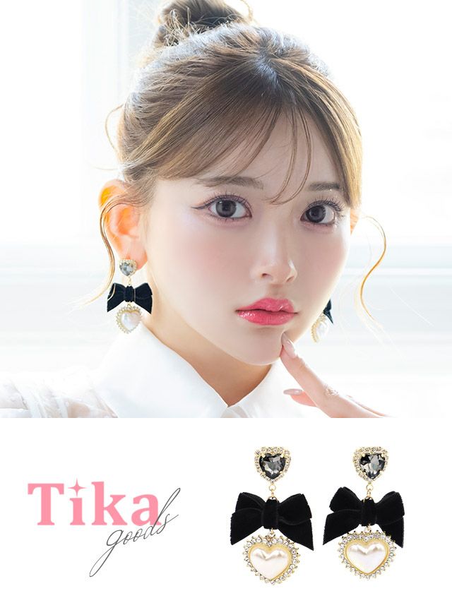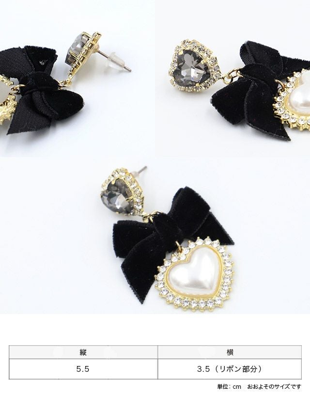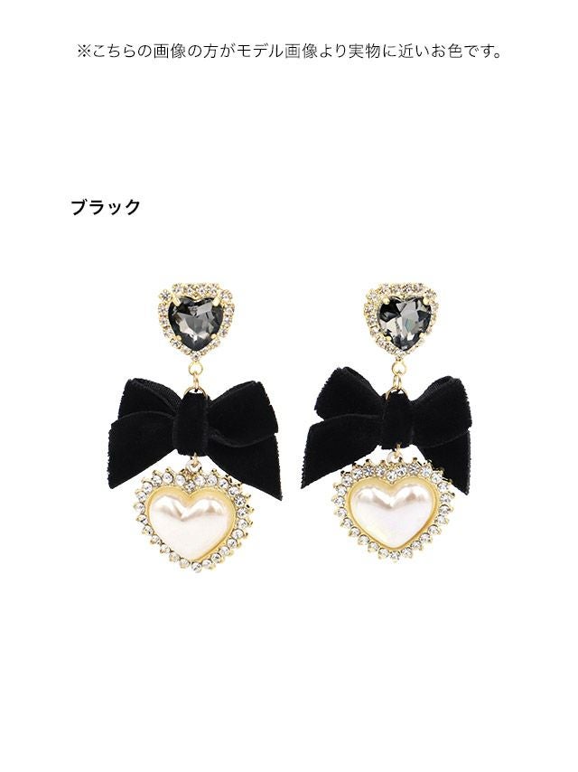 パールハートビジュー付きベロアリボンピアスのメイン画像