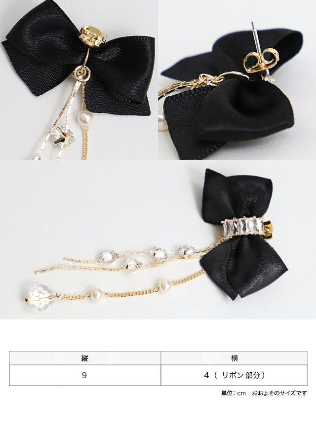 ロングチェーンビジュー付きリボンピアス