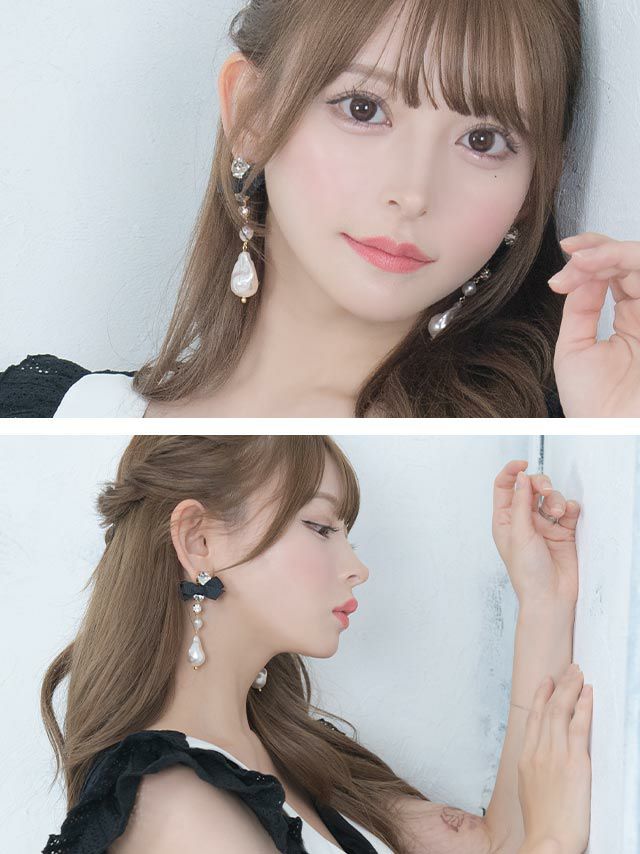 存在感を引き立てるガーリーアイテム♪ 変形パールビジューリボンピアス