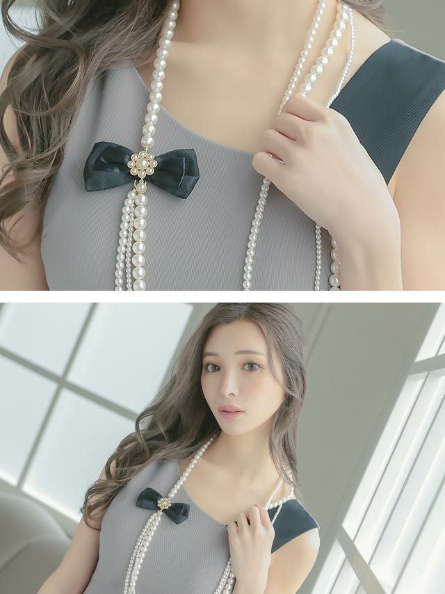 ドレス姿をさらに可愛く華やかに格上げ♪ リボンビジュー付きパールロング3連ネックレス