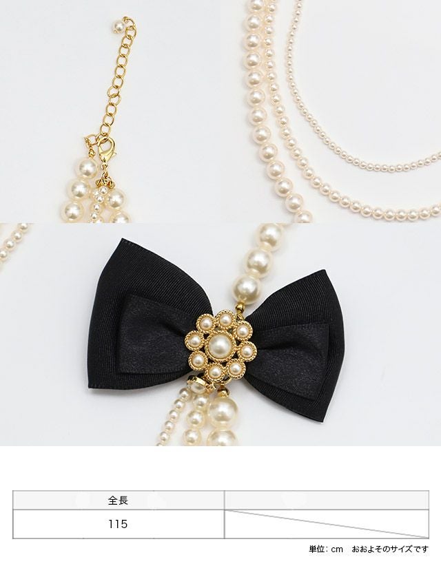 リボンビジュー付きパールロング3連ネックレスのディティール、サイズ