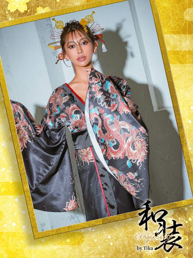 花魁サテンゴージャスドラゴンプリント和装ドレス